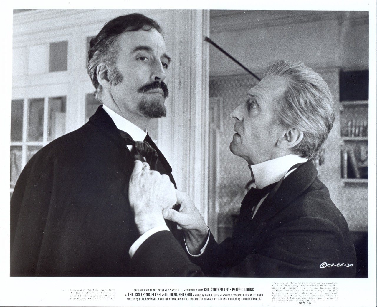 Una delle pellicole in cui questa loro propensione è più evidente è Il terrore viene dalla pioggia (The Creeping Flesh, 1973), un film diretto con maestria da Freddie Francis e prodotto dalla casa di produzione inglese Tigon, dove fu proprio la presenza dei due attori a evitare che le assurdità della trama sconfinassero nel ridicolo. Il regista, in particolare, lodò la capacità di Cushing di “rendere ogni cosa credibile e ce n’era bisogno in un film come questo, lui portava una totale convinzione in ogni cosa che faceva” (R. Salvagnini, Christopher Lee, Peter Cushing e Terence Fisher: due amici e chi li ha fatti conoscere, in: F. Zanello, Christopher Lee il principe delle tenebre, Profondo Rosso, Roma 2008, p. 39). Il ruolo di Christopher Lee risultava meno preponderante ma comunque efficace e riproponeva una tipologia di personaggi freddi e altezzosi per lui abituale. Cushing, vero protagonista del film, ne era il contraltare più umano e sensibile, anche se a tratti molto ambiguo.
