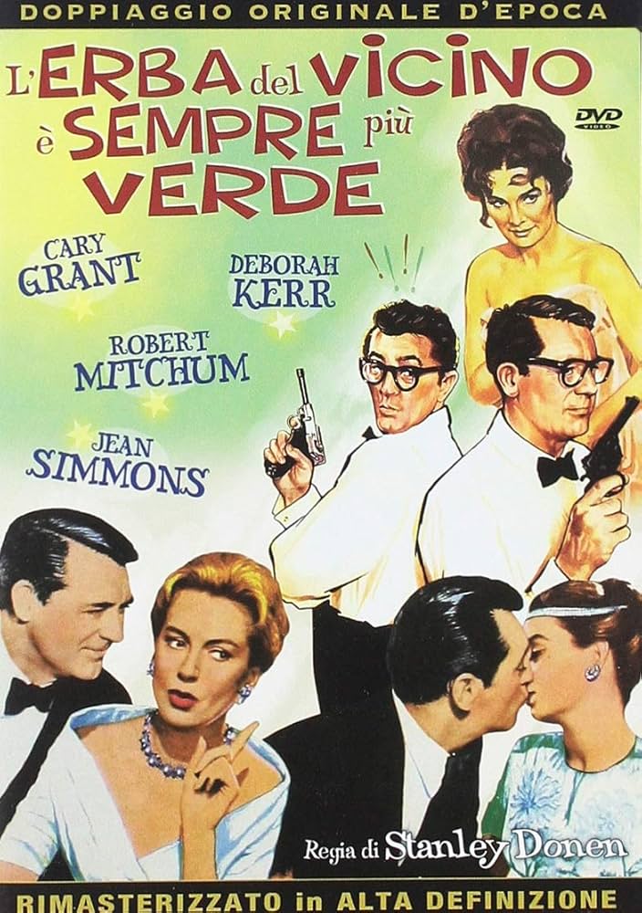 L’erba del vicino è sempre più verde è un brillante adattamento dai toni inglesi che precede l’originale rilettura della commedia dalla forte caratterizzazione hitchcockiana che rappresenterà forse l’apice della collaborazione tra Donen e Grant, ovvero il fortunato Sciarada ancora oggi immune dalle lievi stucchevolezze che invece trapelano da L’erba del vicino è sempre più verde. Tuttavia il film del 1960, nel portare in scena la farsa di una coppia sedotta da un’altra coppia, ha nei dialoghi e negli interpreti i suoi punti di forza. Nell’intento di sottolineare soprattutto la differente impostazione culturale e sociale tra il capitalismo americano e la raffinata nobiltà britannica, Donen ritrova la coppia di attori di Una sposa sognata e Un amore splendido, Cary Grant e Deborah Kerr, e la sintonia tra gli interpreti è particolarmente vivida, dando vita ancora una volta a un sodalizio artistico che fa nettamente la differenza. La fragile situazione finanziaria di Lord Victor Rydall (Cary Grant) lo spinge ad aprire il suo castello alle comitive turistiche, proprio come altri “compatrioti” sono costretti a fare per tenere in vita quella parte di mondo e di tradizione. Tra i visitatori minuti di biglietto (ma anche di impudenza) si presenta un giorno il miliardario americano Charlie (Robert Mitchum), in cerca di avventure. Le sue attenzioni cadono su Lady Rydall (Deborah Kerr), la quale subisce il fascino dell’uomo, tanto che, per vedere più chiaro nei propri sentimenti, con una scusa si recherà a Londra per trascorrere qualche giorno con l’americano. Il comportamento di Hilary non sfugge a Victor, che dalle maligne rivelazioni di un’amica di famiglia da sempre innamorata di lui (Jean Simmons) viene a sapere della situazione.