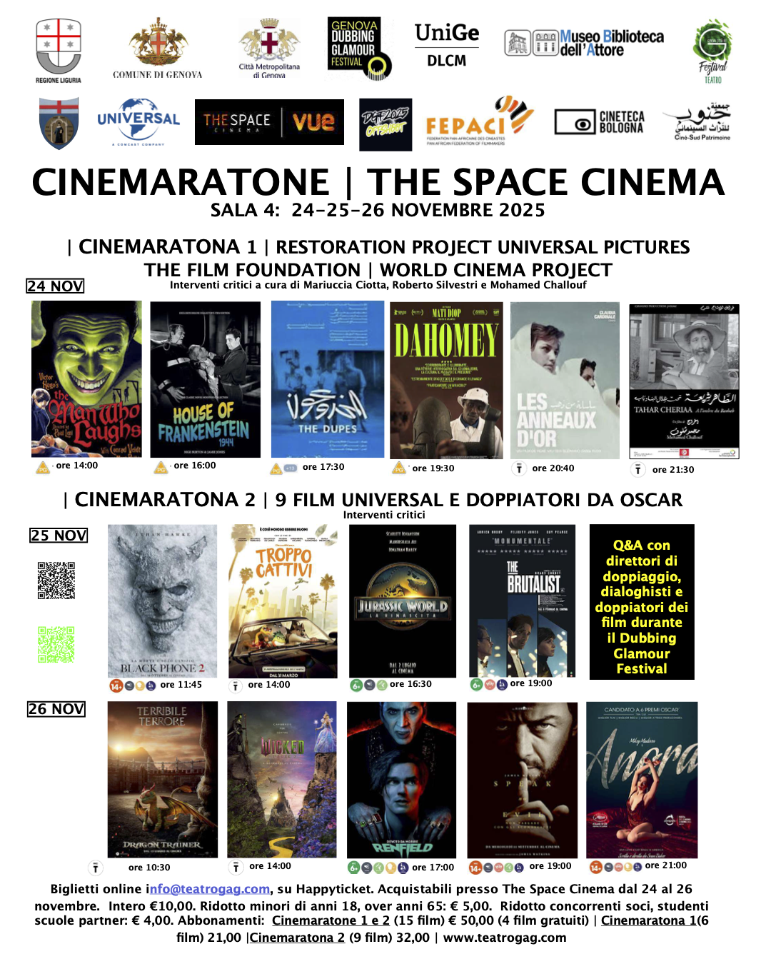 Dal 24 al 26 novembre, il The Space Cinema Genova ospiterà le cinemaratone internazionali: tre giorni di proiezioni con particolare attenzione al cinema antico e al cinema africano, accompagnate da Q&A con doppiatori, dialoghisti e direttori di doppiaggio. Un’occasione unica per scoprire film rari, cinema d’autore internazionale e i processi di adattamento cinematografico.